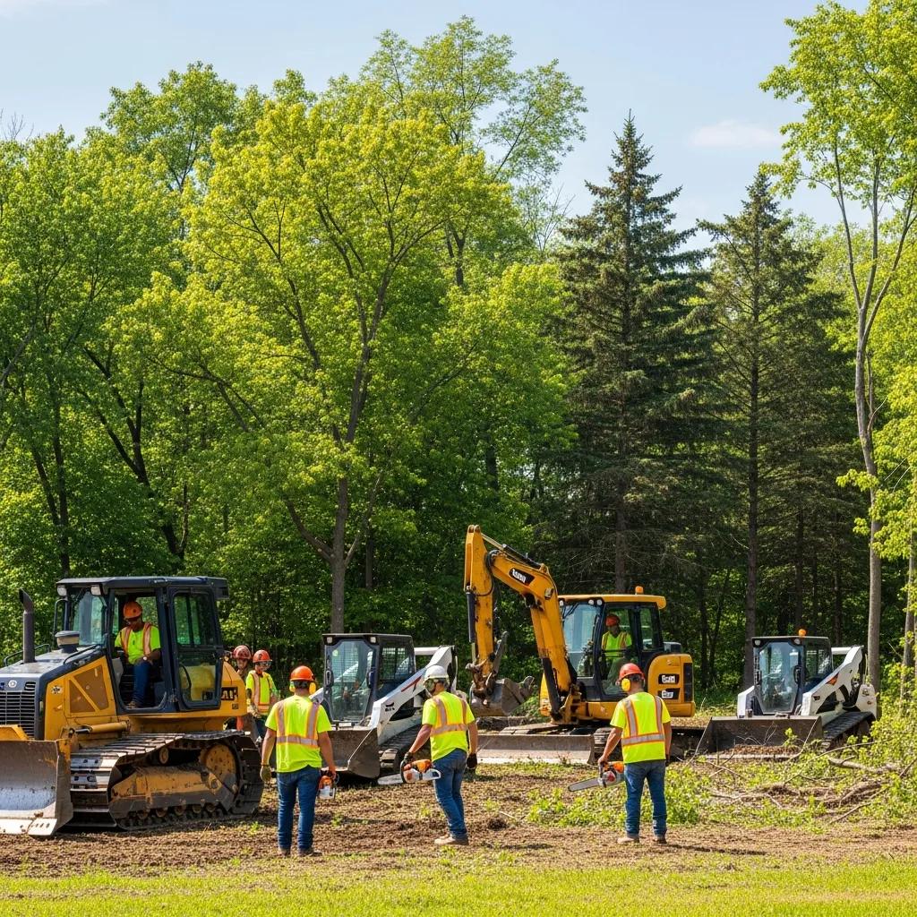 Workers in safety gear operating heavy machinery for land clearing in Waukesha County, including bulldozers and excavators, surrounded by trees and cleared land.